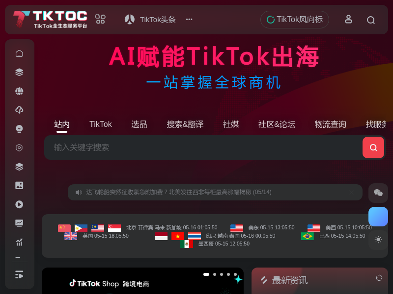 站点描述:TKTOC跨境导航是为TikTok卖家提供的专业TikTok一站式的运营必备工具箱,面向TikTok运营者以及跨境出海卖家,提供TikTok运营、学习教程、工具、直播、变现、数据分析、广告投放、社媒营销等一站式的TikTok运营必备工具,让跨境出海更简单、更便捷!
