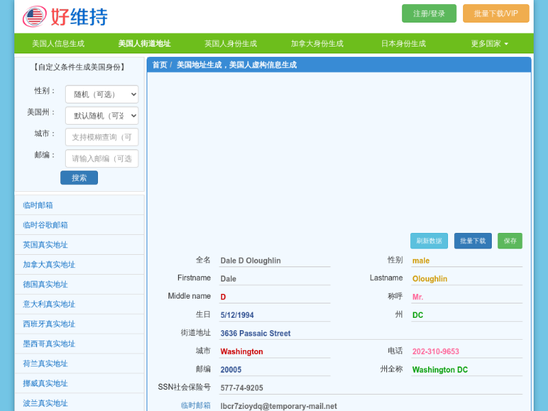 站点关键:美国地址生成,美国人虚构信息生成-世界各国虚拟身份信息、地址、信用卡生成