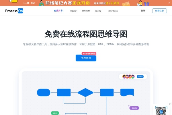 站点描述:ProcessOn是一个在线协作绘图平台,为用户提供强大、易用的作图工具!支持在线创作流程图、思维导图、组织结构图、网络拓扑图、BPMN、UML图、UI界面原型设计、iOS界面原型设计等。同时依托于互联网实现了人与人之间的实时协作和共享。