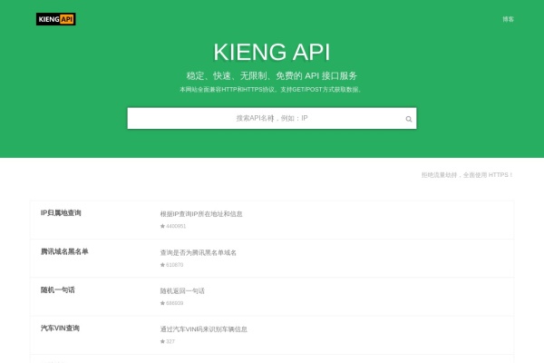 站点描述:KIENG免费API平台-免费|无次数限制|快速响应|API接口