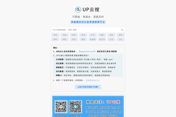 站点描述:UP云搜,阿里盘搜,最优秀的阿里云盘搜索服务的平台,收集各类阿里云盘资源提供一站式搜索功能,推动互联网优质资源的高效传递!