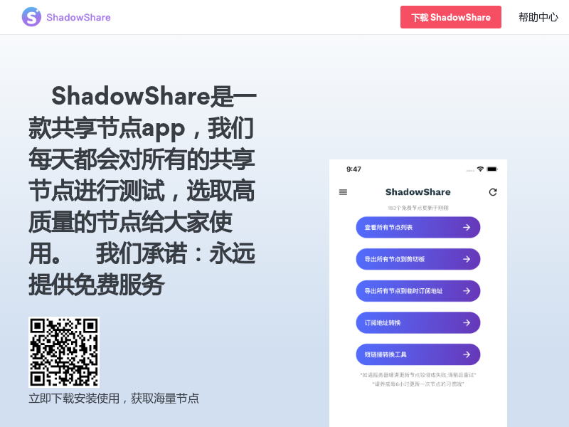 站点关键:ShadowShare是一款共享节点app,我们每天都会对所有的共享节点进行测试,选取高质量的节点给大家使用。 我们承诺:永远提供免费服务