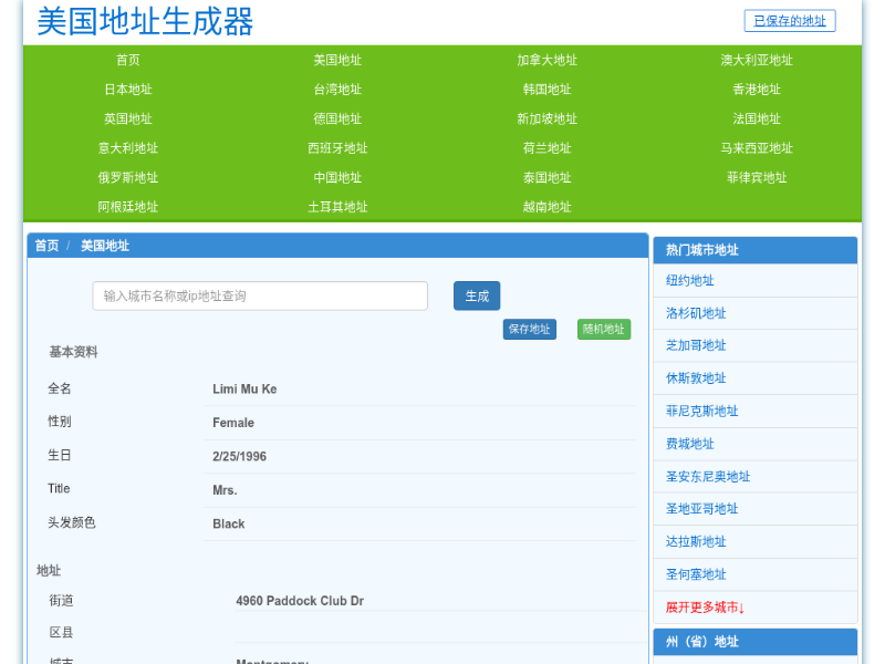 站点关键:美国地址,随机地址,生成地址,信用卡生成器,美国身份生成器