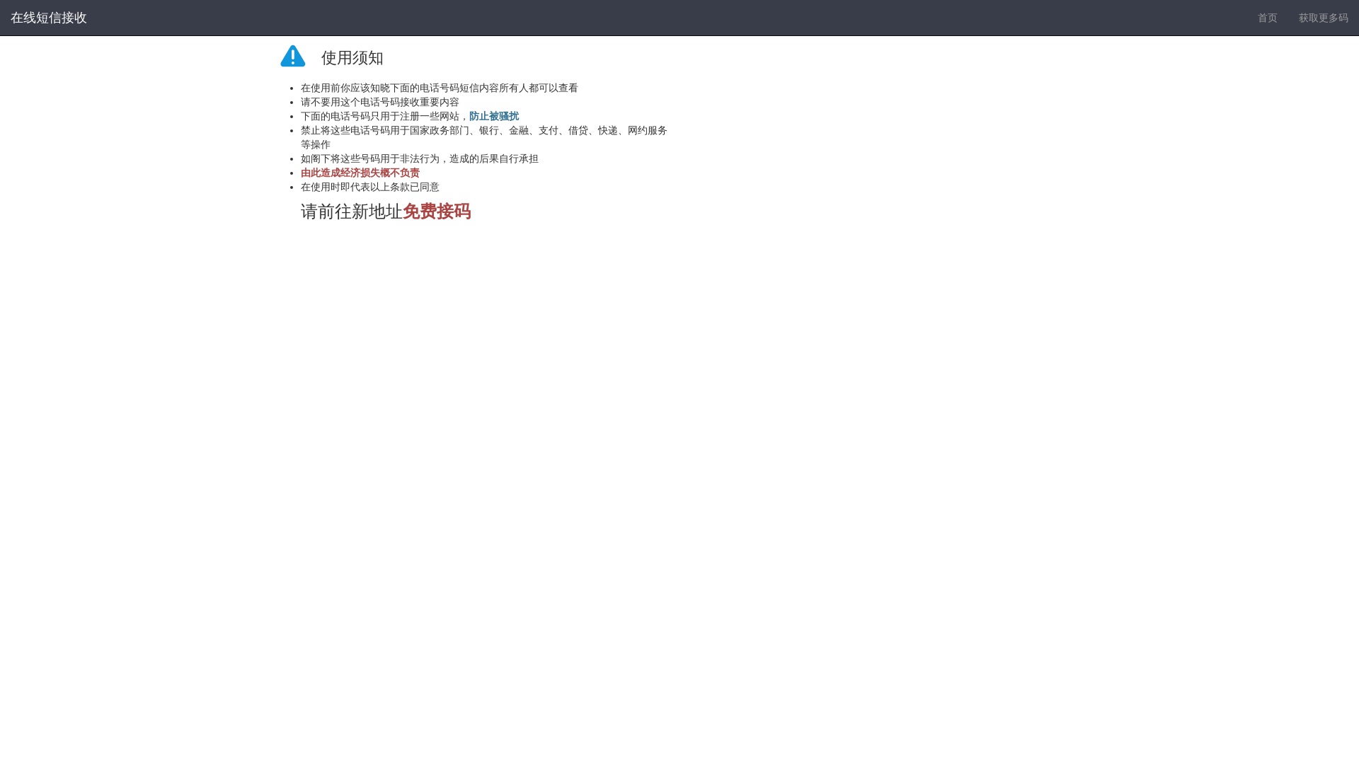 站点描述:本平台提供在线接收短信、代收短信验证码服务。完全免费,不用提供任何个人信息,不用注册,不用扫码,不用加群,不用点广告,不用下载软件或者APP。提供免费的国内外手机号,操作简单,界面简洁,短信显示迅速,比国外类似短信验证码接收平台更快捷