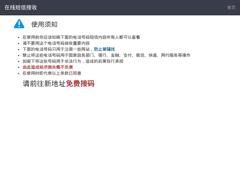 站点描述:本平台提供在线接收短信、代收短信验证码服务。完全免费,不用提供任何个人信息,不用注册,不用扫码,不用加群,不用点广告,不用下载软件或者APP。提供免费的国内外手机号,操作简单,界面简洁,短信显示迅速,比国外类似短信验证码接收平台更快捷
