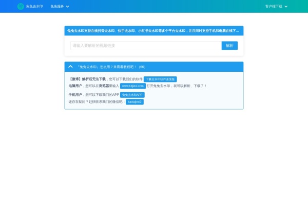 站点描述:兔兔去水印支持在线抖音去水印、快手去水印、小红书去水印等多个平台去水印,并且同时支持手机和电脑在线下载无水印视频