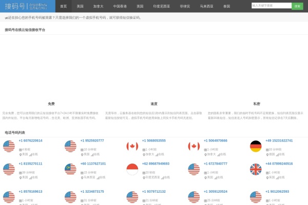站点描述:接码号免费在线短信接收平台,验证码接收平台,最新国外接码平台,海量临时虚拟手机号云短信接码,拥有中国香港/美国/英国/马来西亚/菲律宾/印度尼西亚/泰国等电话号码