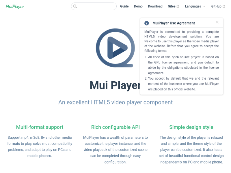 站点描述:Mui Player 一款优秀的 HTML5 视频播放器组件