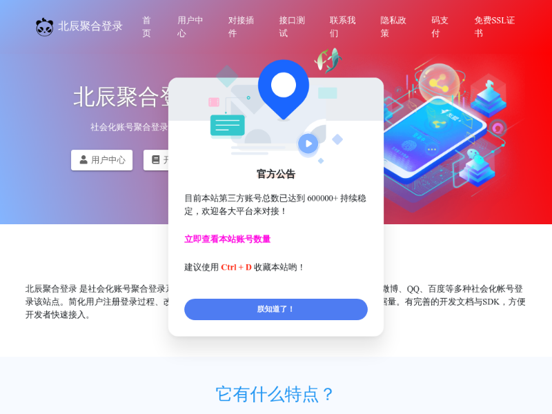 站点关键:北辰聚合登录是社会化账号聚合登录系统,让网站的最终用户可以一站式选择使用包括微信、微博、QQ、百度等多种社会化帐号登录该站点。简化用户注册登录过程、改善用户浏览站点的体验、迅速提高网站注册量和用户数据量。有完善的开发文档与SDK,方便开发者快速接入。