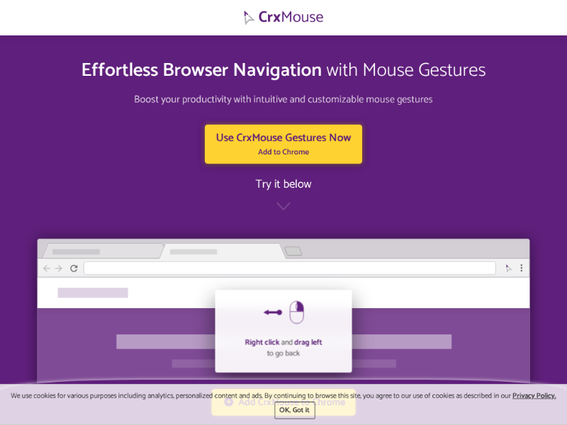 站点描述:使用鼠标手势轻松进行浏览器导航 通过直观且可自定义的鼠标手势提高您的工作效率